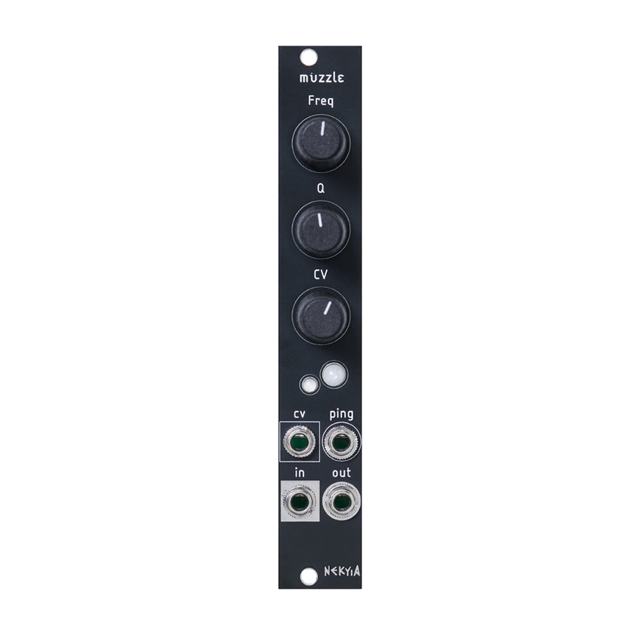 Muzzle is an analog vactrol based 12dB/octave low pass filter and low pass gate. The resonance goes from smooth to increasingly acidic and bubbly towards the max setting. Muzzle can create very interesting percussive sounds when in self-oscillation which can be dynamically controlled through the ping input which also activates a circuit that adds extra grit. The white LED is part of this circuit! Muzzle is perfect for creating additional harmonics and give life to any dull/sterile sound!
