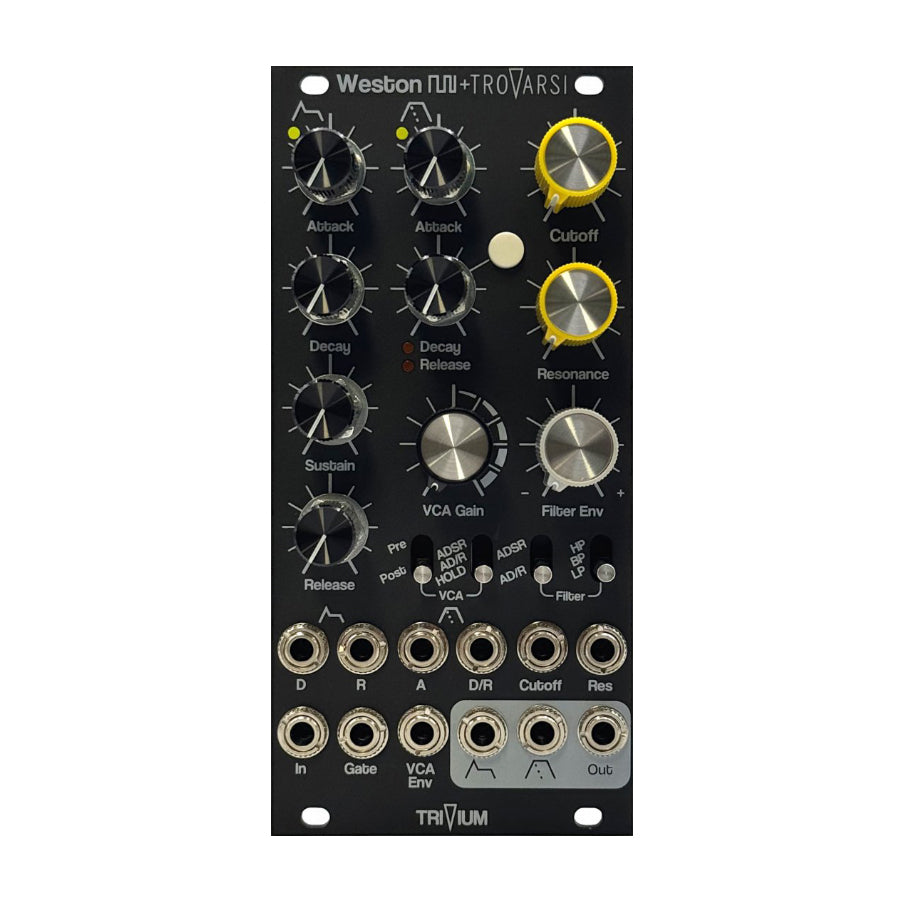 Trivium is a collaboration between Weston Precision Audio and modular/hybrid music performer and producer Trovarsi. At the most basic level, Trivium provides all that you need to make a versatile voice in your modular synthesizer with the addition of any signal source such as a VCO, all in a compact 12HP package.