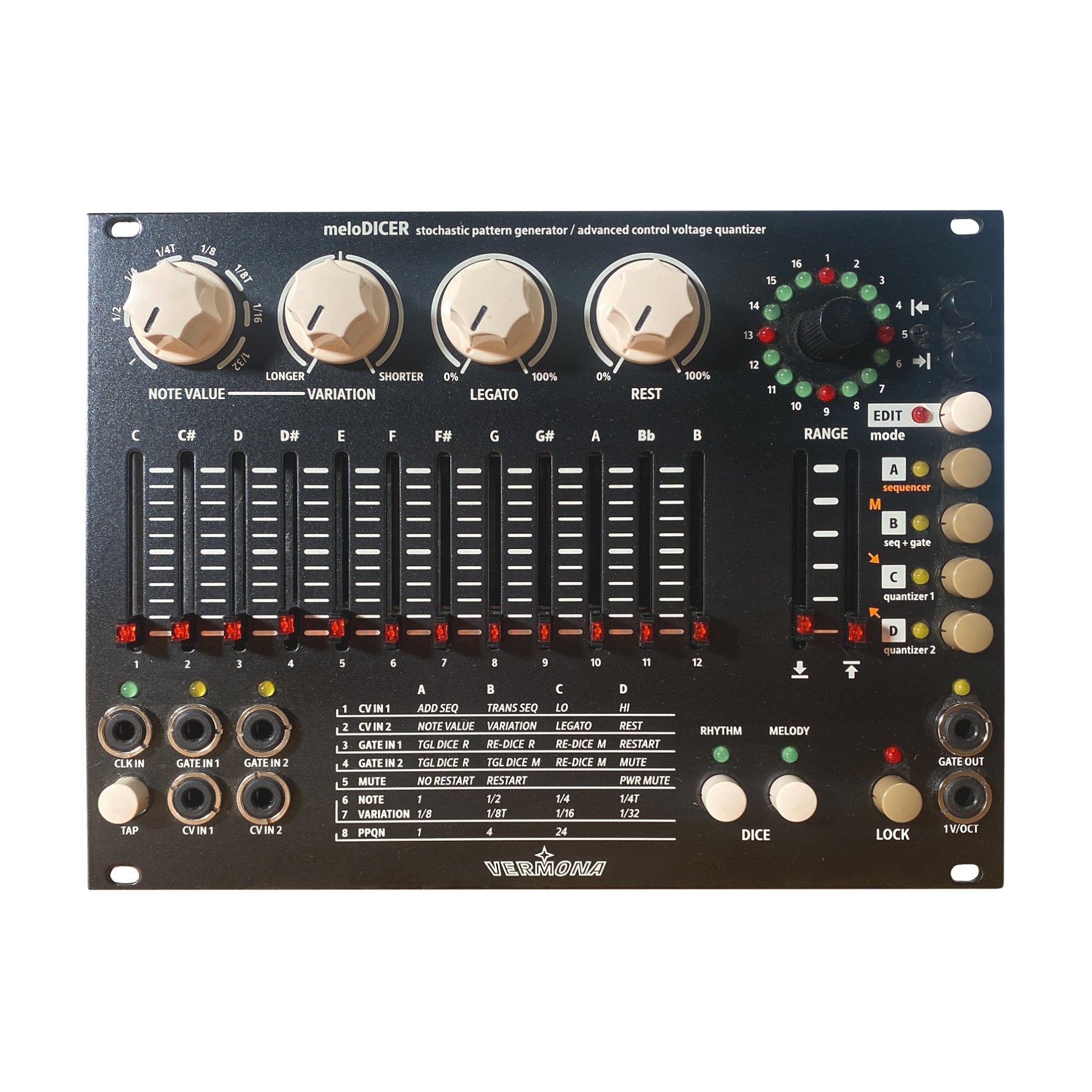 The module’s algorithms generate random values that magically turn into musical events only through your defaults. MeloDICER has a well-thought-out set of control elements that makes it easy for you to conduct rhythm and melody in any wanted direction. It doesn’t matter if you are a music theory genius or if you never heard of triplets, ties, and the like. Just take a look at the module’s surface and start playing with meloDICER. Yes, it’s that simple.