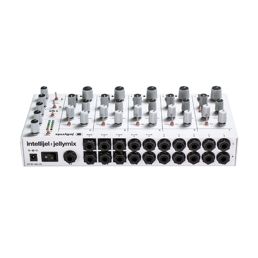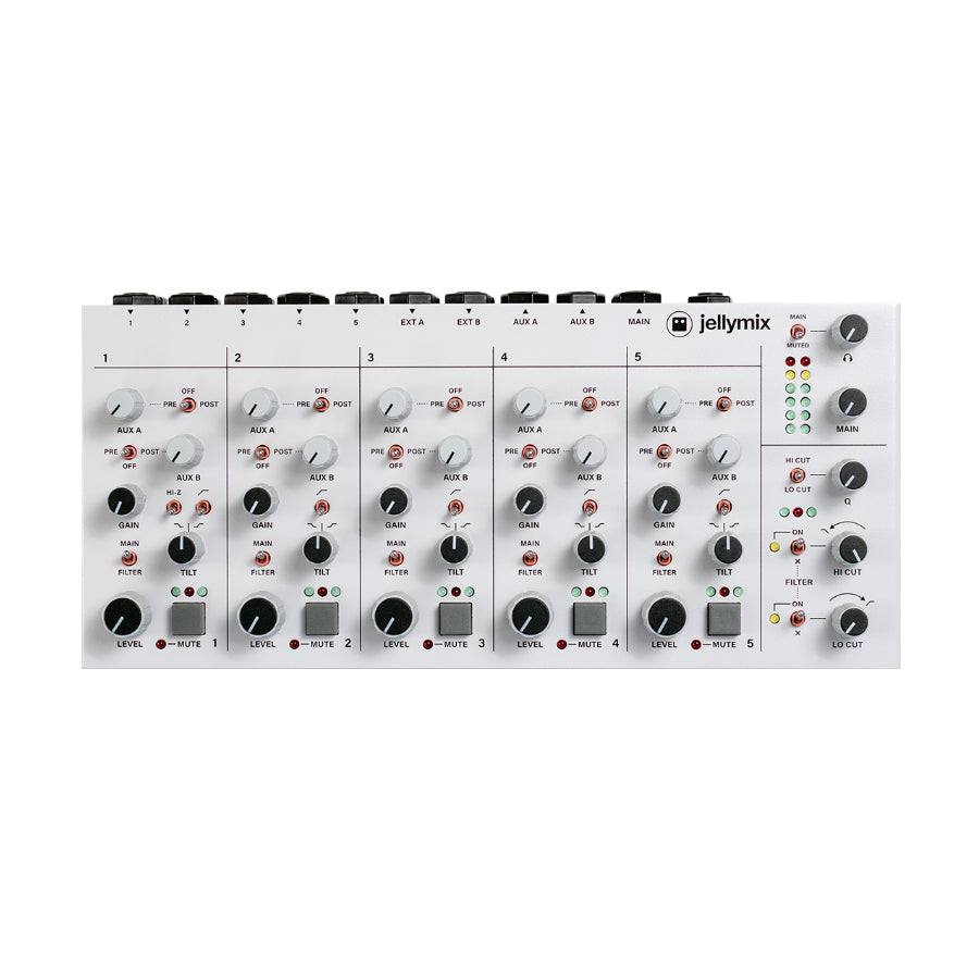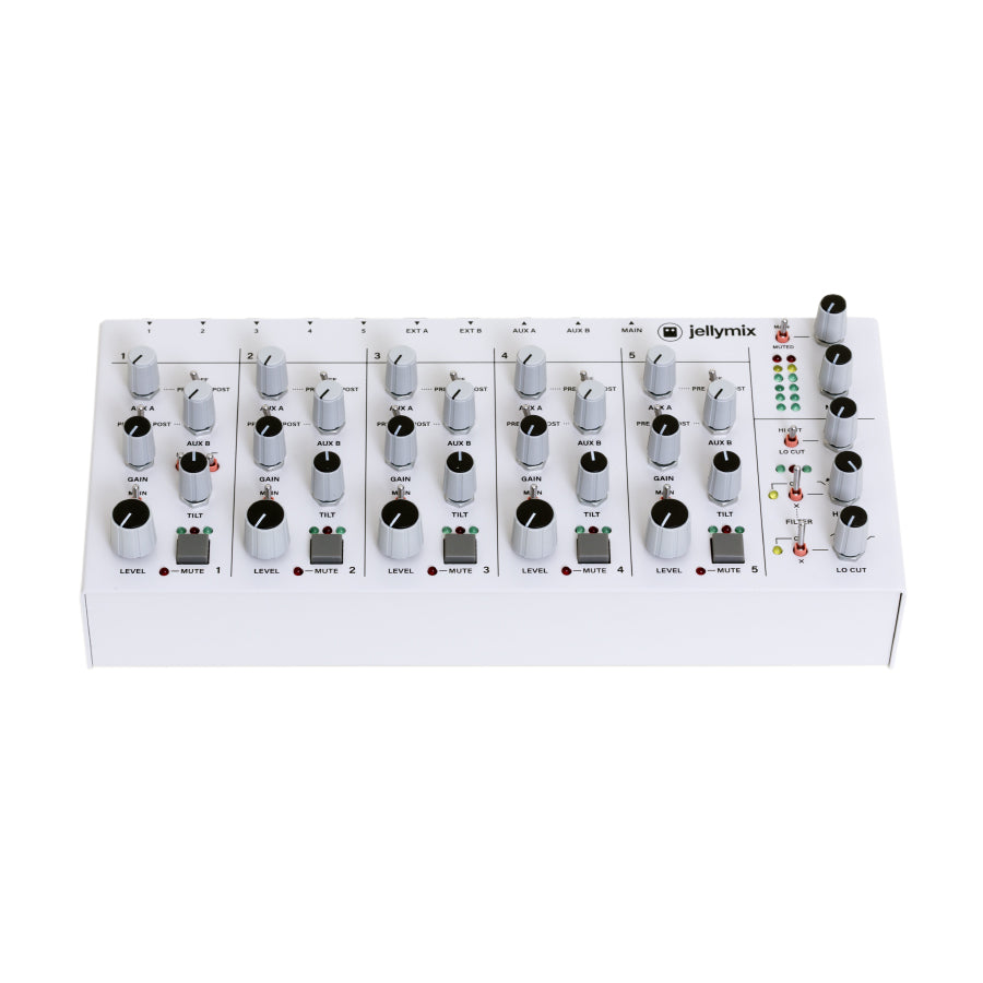 Jellymix is a compact stereo performance mixer designed for electronic musicians. Connect your favourite synths, drum machines, modules, and grooveboxes to the five stereo input channels. Shape your sounds live with channel EQ, the dual stereo resonant filters, and stereo effects on the two stereo AUX busses. The tactile and inviting interface of Jellymix is perfect for knob twiddling, switch flicking, and/or button pushing your way to new sonic joys and dubby dreams; live on stage, your living room, or in the studio.